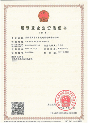 蘇州市吳中區(qū)東吳建筑有限責任公司,具有房屋建筑施工總承包一級、裝飾裝修工程設計與施工二級一體化資質(zhì)、機電設備安裝三級資質(zhì)、市政公用總承包三級資質(zhì)企業(yè),通過ISO9001質(zhì)量管理體系認證、資信等級AAA級。